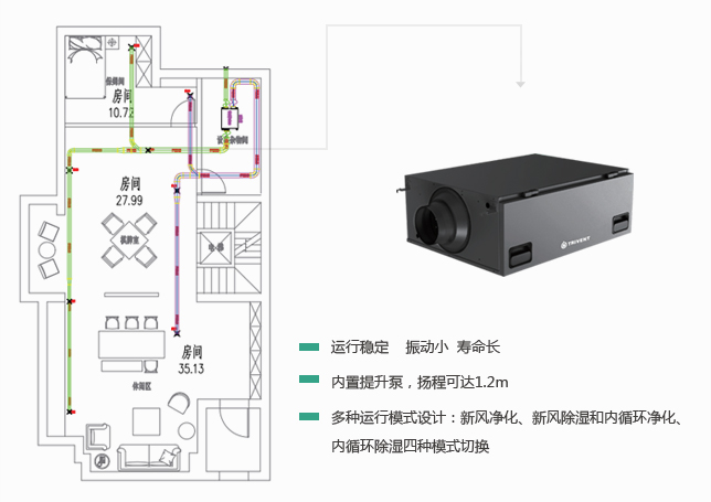 多种运行模式设计:新风净化、新风除湿和内循环净化、内循环除湿四种模式切换